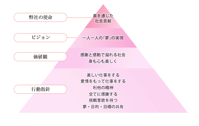 私たちはエステティックサロンを架け橋として、感動のある商品やサービスの創造、提案にプロ意識を持ち「若さ」・「美」を求める現代女性をサポートし美しく健康的な生活の発展に貢献したいと考えています。